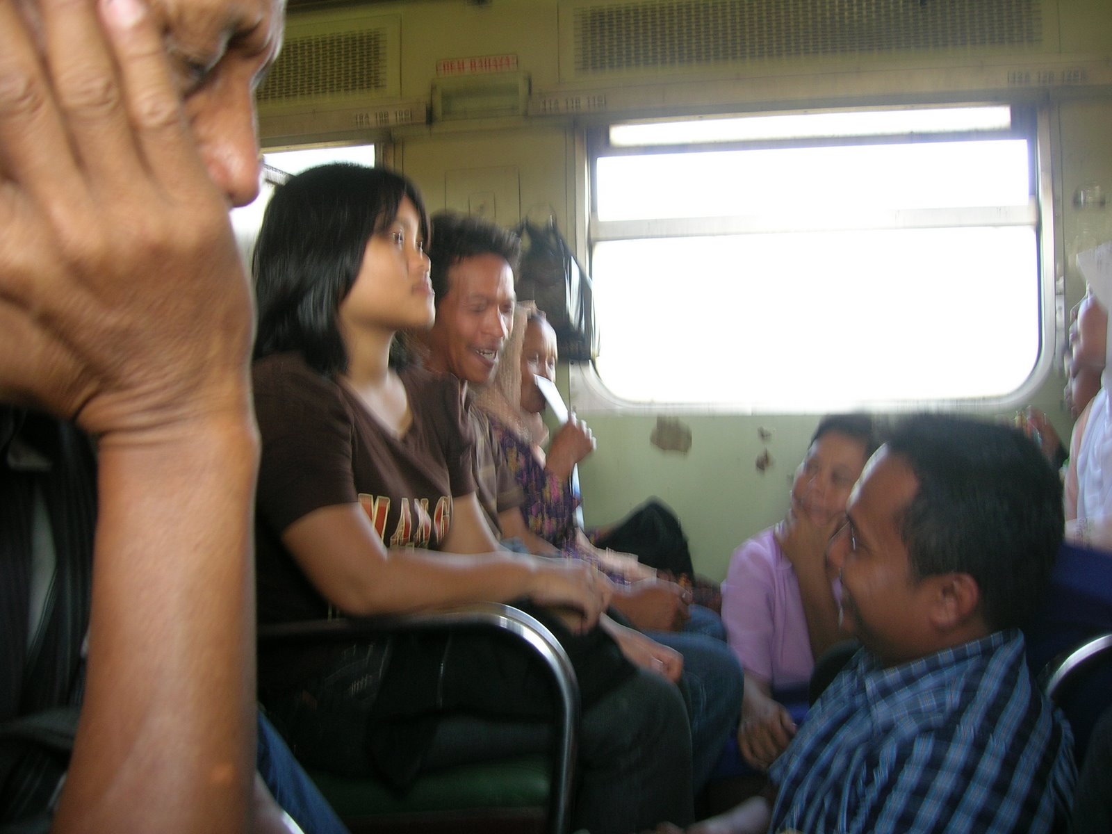 Kereta itu begitu sesak. Ibu-ibu, bapak-bapak, anak-anak, pak de, oom, tante, mbak-mbak, nenek, opung, bu de, pedagang, pengemis, serta kardus-kardus dan aneka tas berjejalan saling berbagi ruang. Panas. Pengap. Bau keringat. Sebuah kondisi yang bisa membuat tombol kesabaran mampu meledak kapan saja. Mana kereta jalannya kayak cacing pita lagi. Halah! (Kayak pernah lihat cacing pita ajah). Dan di suasana kayak begitu, saya pikir yang bisa saya lakukan cuma… Coba nikmati saja…. kalau saya bisa melewati perjalanan ini dengan hepi, maka saya pasti bisa melewati perjalanan lain dengan hepi pula. Yup! Sepertinya ini perjalanan terberat pertama saya. Permasalahan serius dengan alat transportasi yang menjadi kendara bepergian kali ini.