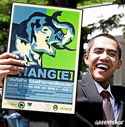 Berikut beberapa foto dari aksi Greenpeace di Thailand, dimana Presiden Barrack Obama membuat geger Bangkok karena tiba-tiba hadir dalam aksi di depan Kedutaan Besar Amerika Serikat di Bangkok ini, dan dalam pidatonya setuju dengan tuntutan Greenpeace agar Amerika berbuat sesuatu untuk menanggulangi perubahan iklim, diantaranya dengan mengurangi emisi gas rumah kaca mereka secara drastis. Ternyata, meski mirip Obama ini bukan Obama asli, melainkan orang Indonesia bernama Ilham Anas, yang memang sangat mirip Obama. Berikut caption dari foto ini, dan press release di bagian paling bawah.