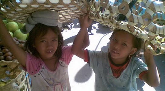 Dua gadis asal Kabupaten Karangasem siang itu tertawa renyah layaknya usia anak-anak umumnya namun dengan cekatan menjinjing mengangkat keranjang sebagai sumber periuk nasinya di atas kepala, guna menawarkan jasa angkat barang kepada warga yang berbelanja di Pasar Badung. Separuh lebih hari-harinya dihabiskan di pasar untuk mendapat pundi-pundi rupiah tanpa mempedulikan kesehatan dan masa depannya kelak.
