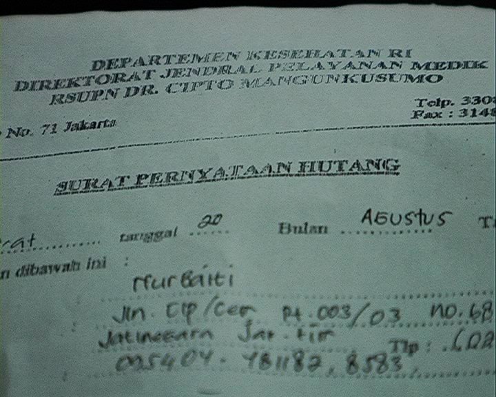 - Mengikuti salah seorang warga binaan JRMK (jaringan rakyat miskin kota) di Penjaringan. Dia seorang tukang air, masuk rumah sakit, tapi dipaksa keluar oleh keluarganya karena tak mampu untuk biaya berobat. Dia dibawa pulang ke semarang dengan menggunakan mobil kijang tetangga (tak mampu menyewa ambulance) dan akhirnya dua hari setelah sampai di semarang, tukang air tersebut meinggal