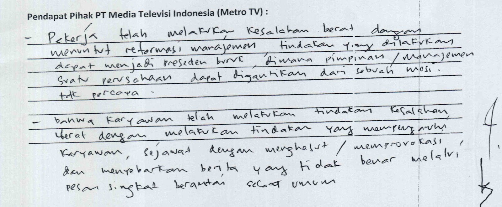 “Suatu hari di bulan maret ketika kami akan melakukan bipartite di metro tv, beriringan menggunakan dua mobil kami ke sana. Tim litigasi dari LBH PERS, teman-teman dari divisi Serikat Pekerja AJI, tim kecil dokumenter saya. Pagi itu sebelum berangkat ke metro tv, Luvi sudah bilang kalau pak Avi dari HRD meminta dia untuk bertemu one on oneterlebih dahulu sebelum melakukan pertemuan bipartite resmi dengan semua pihak terkait. Ali dari LBH pers menyatakan hal tersebut biasa dilakukan oleh pihak perusahaan untuk memecah konsentrasi pegawai yang menentang mereka. Lobby dan biasanya umbaran janji-janji akan dilakukan dan diberikan pihak perusahaan hingga sebelum pertemuan bipartite yang melibatkan pengacara dan bersifat remi terjadi, diharapkan pikiran si karyawan yang awalnya menuntut beberapa hal pada manajemen, jadi berubah dan jadi melunak atau bisa lebih akomodatif.