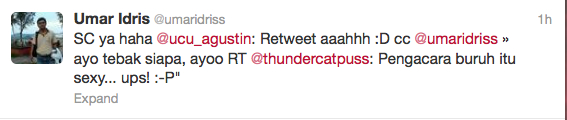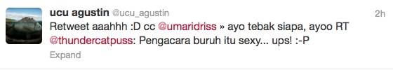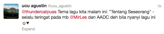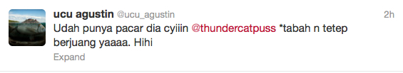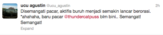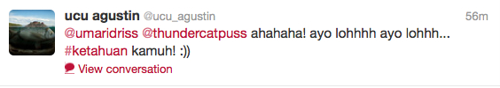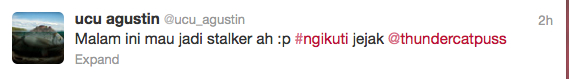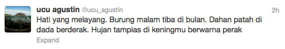 …Tapi tweet di twitter yang tadi ditulis ketika perasaan itu sedang merebak, hehe, rasanya mungkin cukup buat bisa dibikin atau dijadiin ilustrasi dari perasaan yang tadi terjadi antara aku dan thundercatpuss. Perasaan-perasaan yang blingsatan sesaat setelah diskusi di petang tadi – sebelum kemudian kami berkendara menembus malam ke arah selatan: