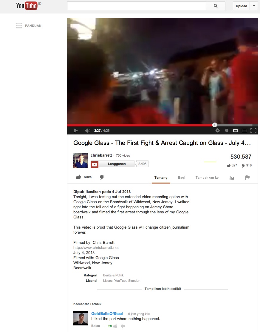 Maka karena penasaran pengen tahu kayak apa sih video yang di-klaim sebagai video ‘penangkapan’ pertama yang tercapture oleh Google Glass, jadilah saya mengikuti apa yang telah dilakukan si independent filmmaker bernama Chris Barret ini ke link youtube-nya dan melihat apa yang dia rekam di tanggal 4 Juli 2013 di Jersey Shore broadwalk di amerika sama.