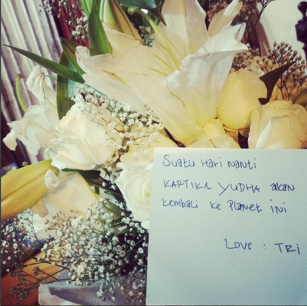 bunga putihmu bikin perasaan dan juga suasana jadi tambah sedih lagi. kalimat di dalam kartunya, bikin kesedihan jadi begitu sarat dan padat. kata-kata yang kamu rangkai di kartu itu jadi semacam janji termanis sekaligus janji yang paling pilu yang pernah aku baca di dalam hidupku yang paling belakangan ini.. dan tentu, aku kan menunggu hari dimana kartika bisa ada tuk bersama-sama kita suatu hari nanti yang semoga tak terlalu lama lagi.